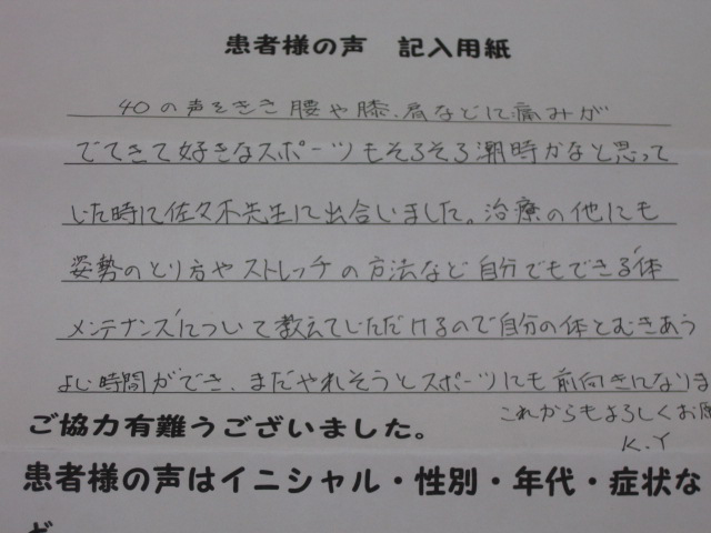 施術の他にも姿勢のとり方やストレッチの方法など自分でも出来る体メンテナンスについて教えていただけるので自分の体とむきあうよい時間ができ、まだやれそうとスポーツにも前向きになりました。